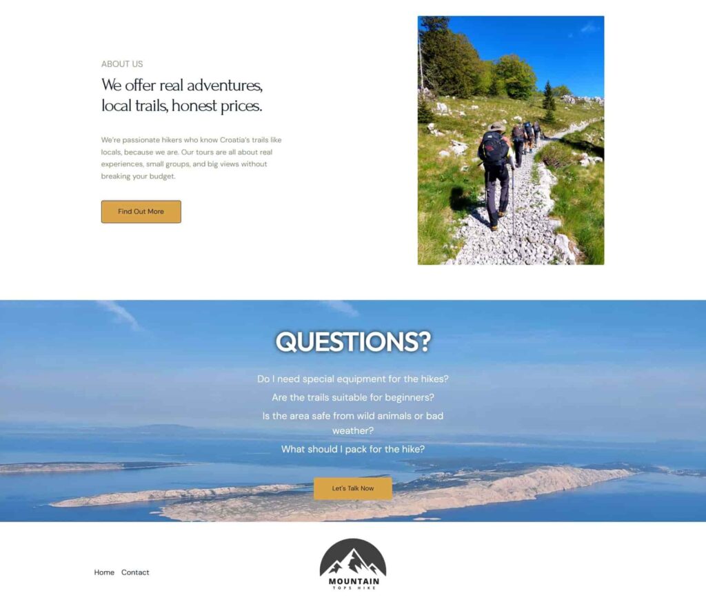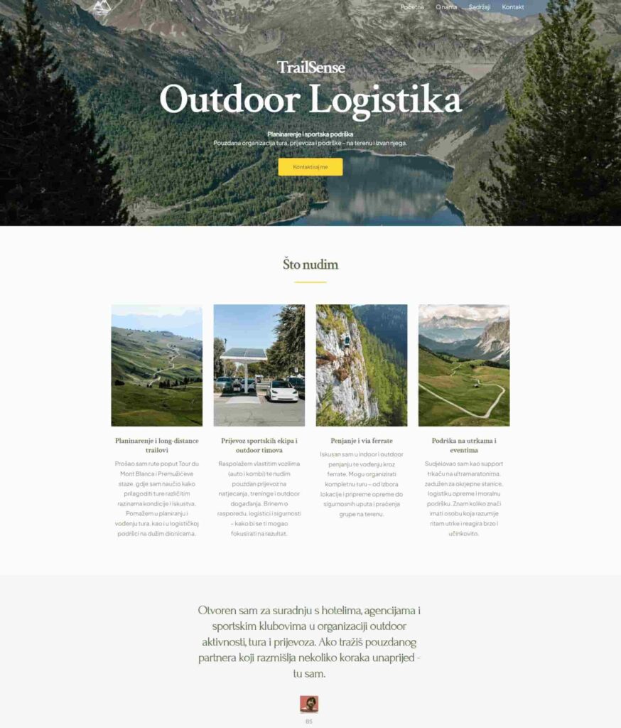 Osobna brend web stranica usmjerena na povjerenje, jasnoću ponude i jednostavnu navigaciju za klijente koji traže organiziranu i vođenu outdoor uslugu. Fokus – jasno predstavljanje usluge i povjerenje.
